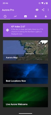 My Aurora Forecast je najbolja aplikacija za posmatranje Severne svetlosti. Uz elegantan tamni dizajn, pruža detalje o verovatnoći viđenja aurore borealis, solarnim vetrovima i snimcima sunca visoke rezolucije. Savršena je za turiste i ozbiljne posmatrače aurore, pomažući vam da Severnu svetlost vidite u tren oka.