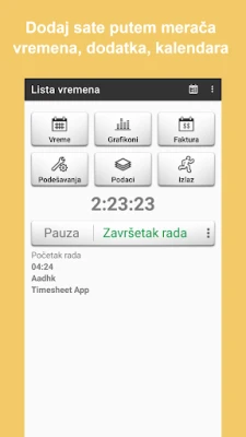 Da li ste preduzetnik, frilenser, ugovarač ili radnik čije se vreme meri po satu? Razumemo izazov preciznog beleženja radnih sati i složenost obračuna zarade. **Praćenje radnog vremena** je vaša esencijalna alatka osmišljena da pojednostavi svaki korak – od beleženja svakog minuta do automatskog izračunavanja plate i generisanja izveštaja za menadžere ili klijenata. Zaboravite na ručne evidencije i neprecizne proračune; sa ovom aplikacijom, upravljanje vašim radnim vremenom postaje intuitivno i efikasno.