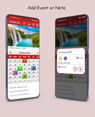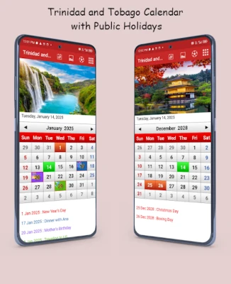 Trinidad and Tobago Calendar je vaš personalizovani kalendar sa državnim praznicima za period 2025-2028. Lako dodajte događaje, beleške i podsetnike, obeležite važne datume i godišnjice. Prilagodite kalendar ikonama, bojama i sopstvenim slikama, nikada više ne zaboravite bitne trenutke.